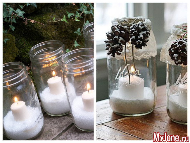 Зажгите свечи – и вот она, атмосфера тихого уютного праздника! Из обычной банки получится этот заснеженный сосуд для свечей. Просто насыпьте в банку немного сахара или соли, которые можно смешать с щепоткой блесток, и поместите любую свечу. Я могу представить, как они светятся теплом и уютом в вечерних сумерках. Так просто, но действительно красиво!