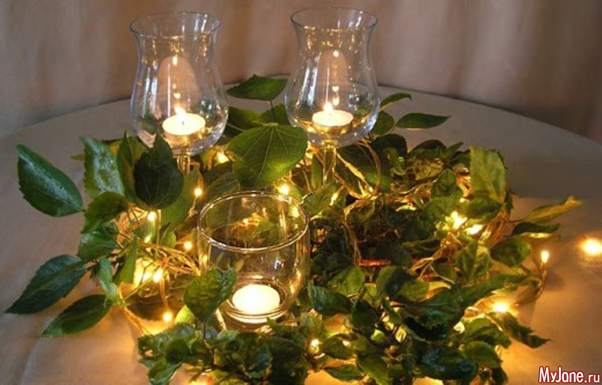 Плавающие свечи в подсвечниках из разнокалиберных рюмок и бокалов красивы еще и потому, что их свет отражается и приумножается блеском воды. Кстати, ободки бокалов можно еще и «заснежить» сахаром или солью, окунув их предварительно в сок лимона или любой прозрачный сироп. Дополните композицию хвойными ветками или любыми другими растениями.