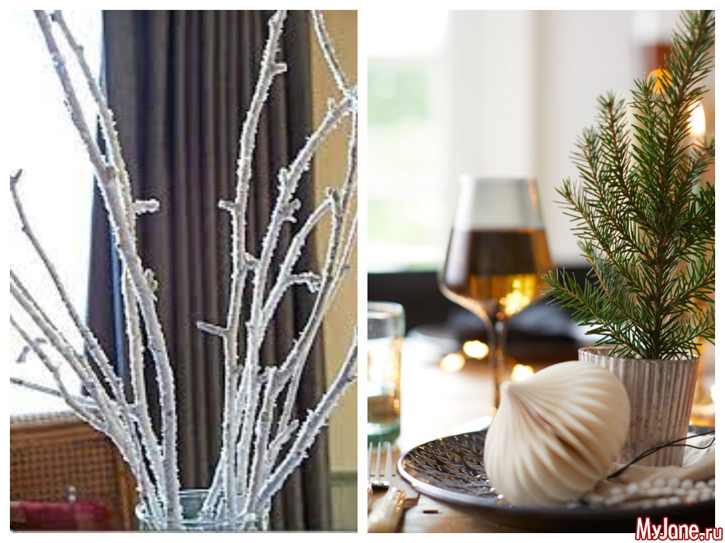 Я нашла много идей для украшения с помощью веток. И это не обязательно должны быть охапки хвои, которые в городе не так-то и просто найти. Сойдет и крохотная хвойная веточка, либо даже вообще не хвойная. Если у вас есть белая аэрозольная краска, украшения и что-то вроде вазы, чтобы все закрепить, - все готово! Если у вас нет аэрозольной краски, смело оставляйте ветку естественной, просто украсьте ее елочными шарами. А еще можно вспомнить, как в школе все мы делали «заснеженные» ветки из солевого раствора – и вперед!