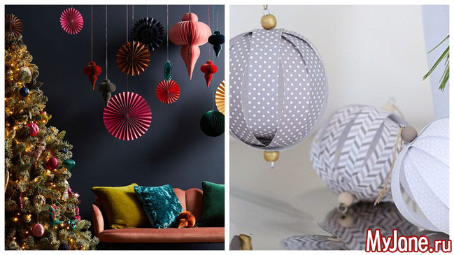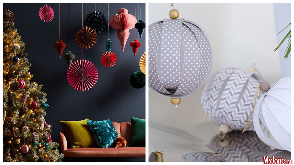 Бумага – один из самых дешевых и доступных материалов для творчества. Особенно для творчества с детьми. В большинстве случаев требуются лишь ножницы, да клей. Если банальные бумажные снежинки или елочные украшения из бумаги вам несколько поднадоели, то лучший вариант добавить оригинальности – сделать их преувеличенно большими. Для таких крупных поделок лучше использовать бумагу поплотнее, либо ненужные куски обоев. Подвесьте их на леску, чтобы создать иллюзию, будто они просто парят в воздухе.
