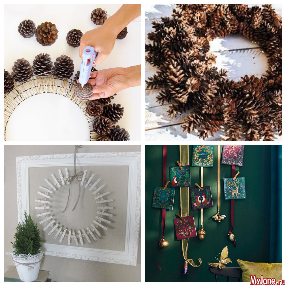 Их можно сделать не только из хвои, но буквально из всего, что попадет под руку: искусственных цветов, мелких игрушек, ракушек или, как пример, собранных в лесу шишек. Еще одна симпатичная идея – рождественский венок из прищепок, на которые можно прикрепить фотографии или новогодние открытки. Впрочем, это может быть вовсе и не венок, а гирлянда.