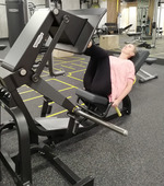 Ягодицы во втором суперсете проработаем из положения лежа на спине с помощью жима ногами. Жмите платформу вверх 12-15 раз, колени до конца не выпрямляйте, стопы держите чуть шире линии плеч на верхнем краю платформы.