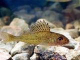 Спинной плавник один, слившийся из двух, покрыт чёрными точками. Передняя часть плавника, состоящая из колючих лучей, немного возвышается над задней, которая состоит из мягких лучей. Колючие лучи имеются на брюшных и анальном плавниках.