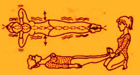 После этого положить ладони под шейные позвонки, локти согнуть, всем телом прижаться к полу. Ноги соединить, пальцы обеих ног потянуть к лицу, все "выпуклости" (затылок, плечи, таз, икры, пятки) вдавить в пол. В этом положении начать выполнять быстрые колебания (вибрации) телом вправо-влево, напоминающие быстро плывущую рыбку.