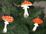Ножку гриба и нижнюю часть шляпки красим белой краской, внизу ножку слегка загрязняем мелко нарезанными кусочками фетра или ниток. Верх шляпки окрашиваем в красный цвет.