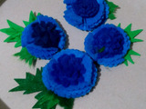 Из фетра василькового цвета вырезаем при помощи ножниц-зигзаг пять кружков одинакового размера. От размера кружка зависит размер будущего цветка. В качестве лекала для кружка я использовала крышечку от банки с кремом диаметром 4 см.