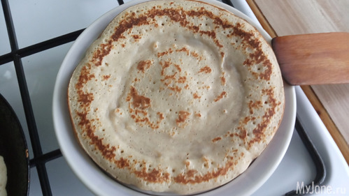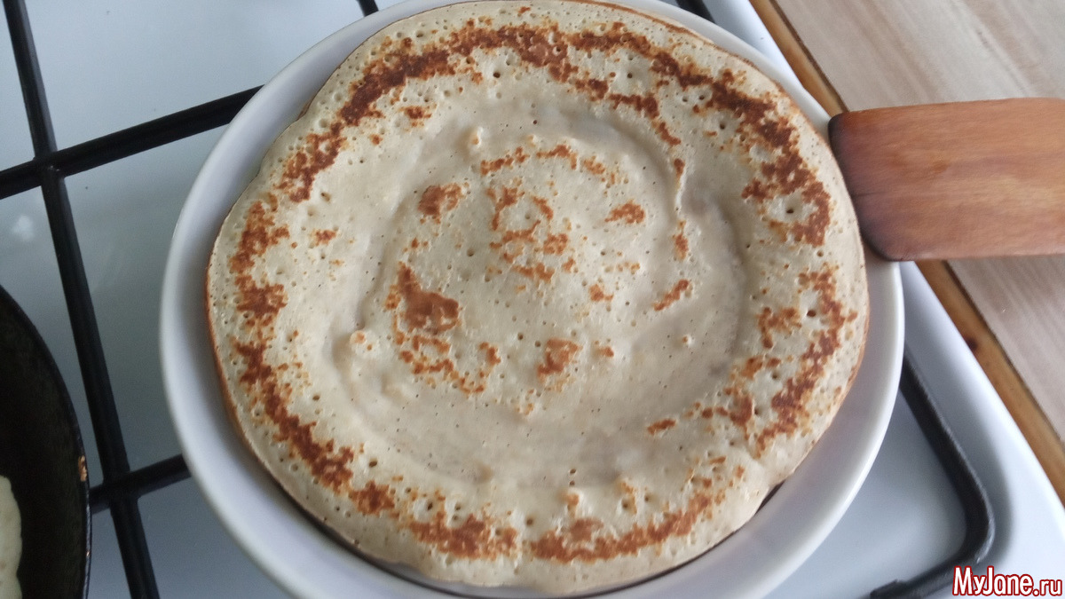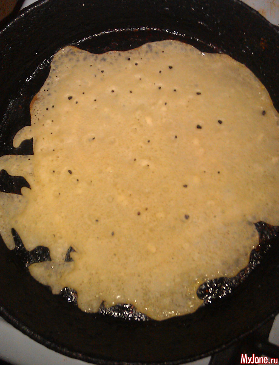 • Разогреть сковороду, смазать рафинированным растительным маслом и выпекать тонкие блины.