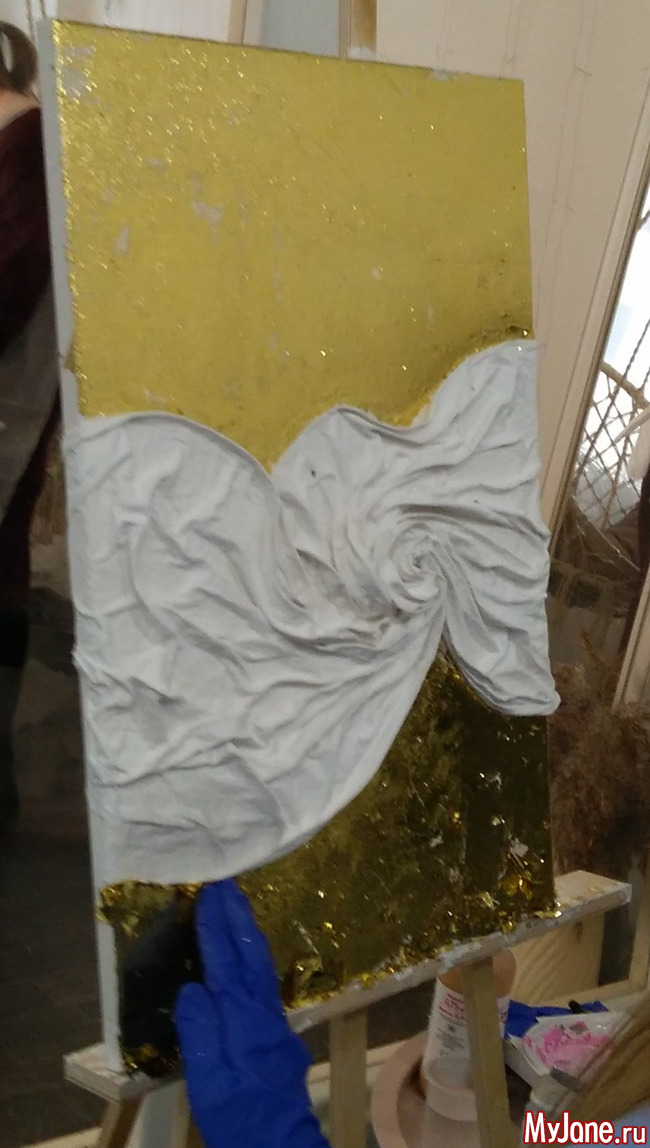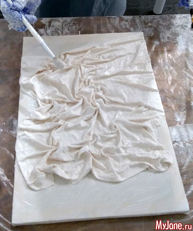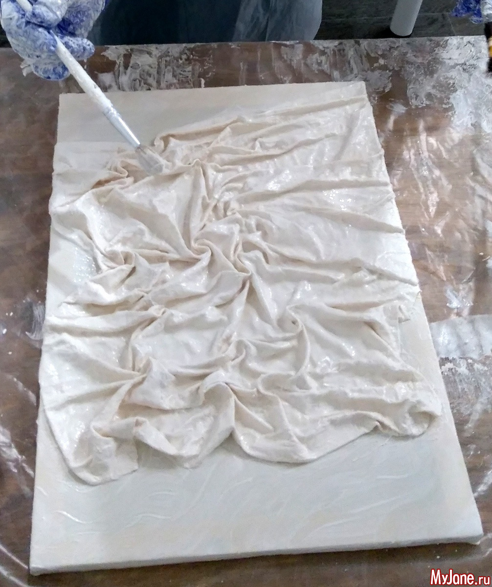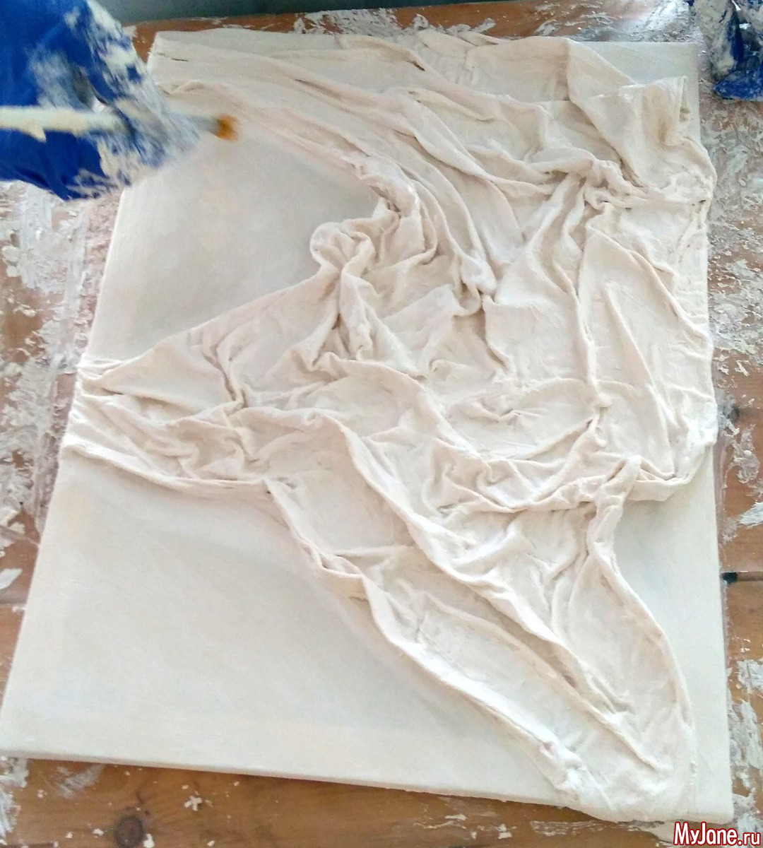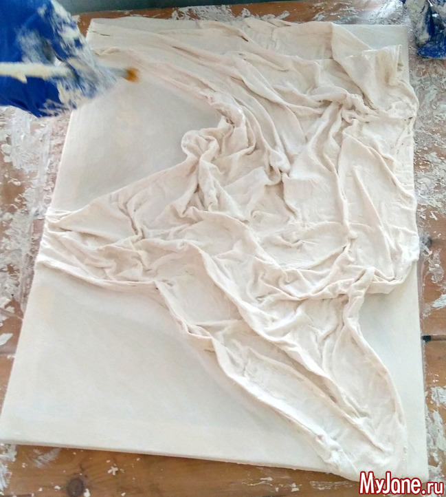 Извлекаем пропитанную гипсом ткань и выкладываем на холст подрамника. Пальцами и кисточкой формируем складки ткани - как подсказывает фантазия или заранее задуманный проект.