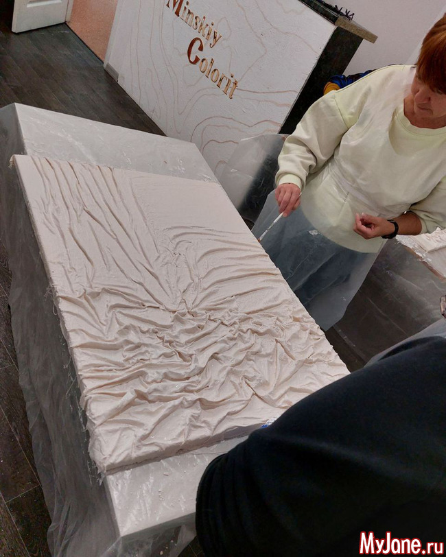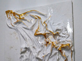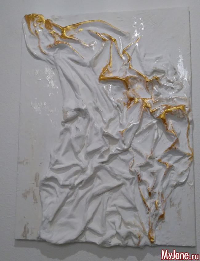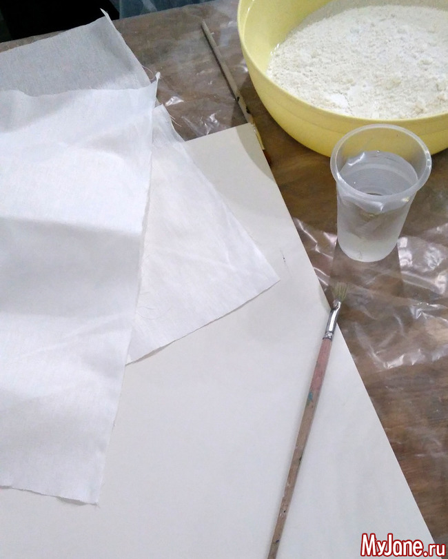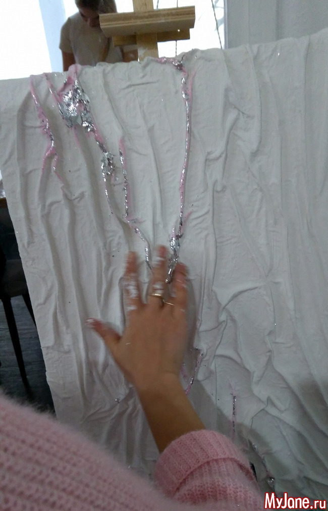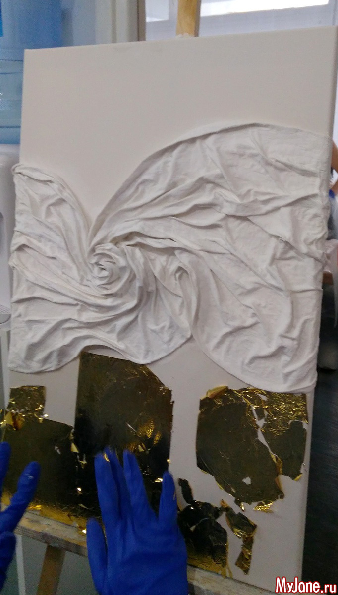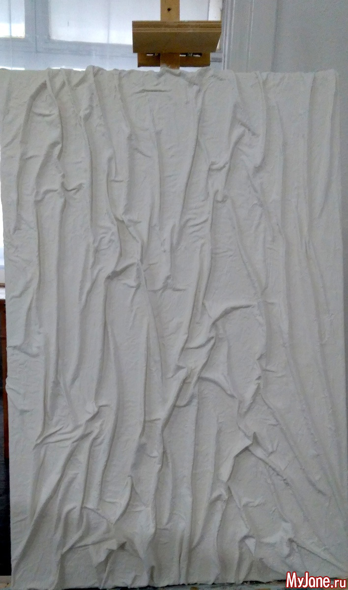 Извлекаем пропитанную гипсом ткань и выкладываем на холст подрамника. Пальцами и кисточкой формируем складки ткани - как подсказывает фантазия или заранее задуманный проект.