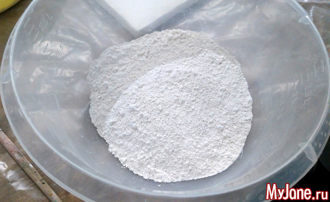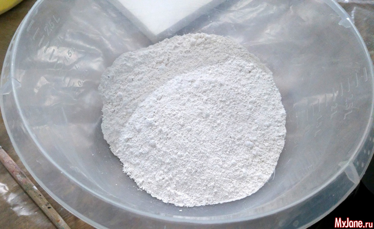 Насыпаем в миску штукатурку, ее количество зависит от размера панно, определяется опытным путем.