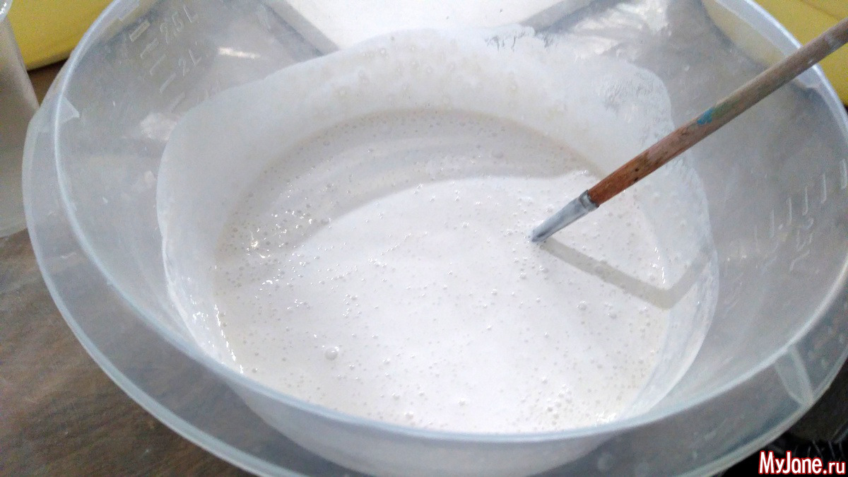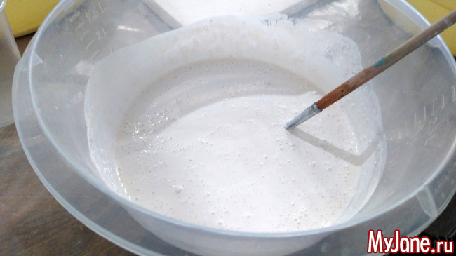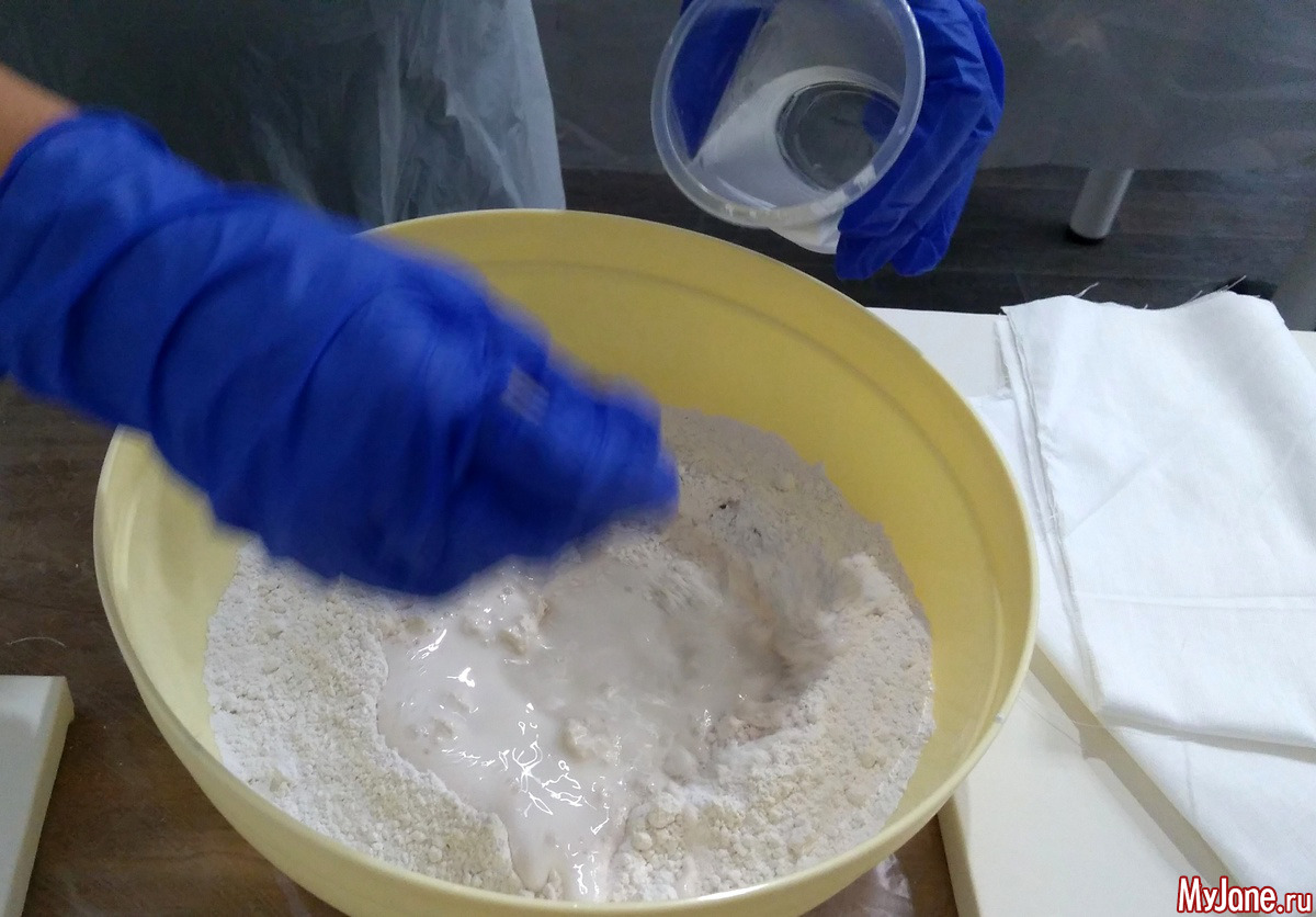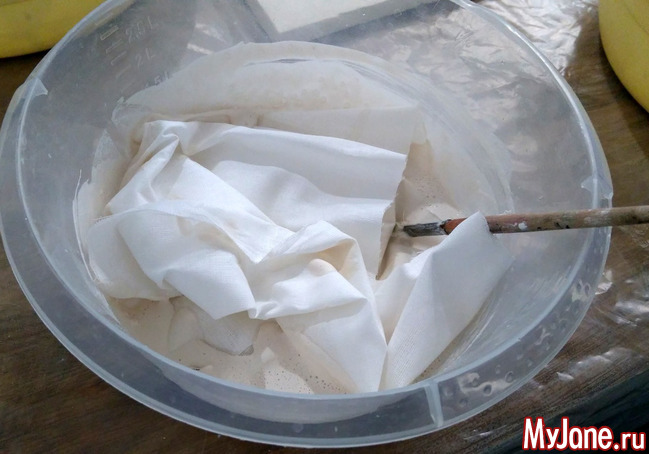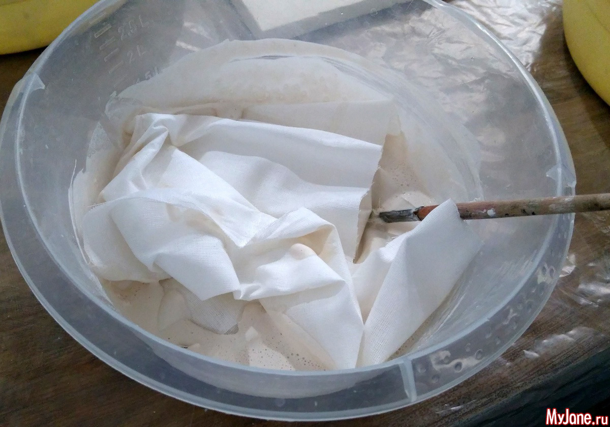 Опускаем ткань в разведенную штукатурку и хорошо пропитываем.