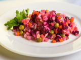 Готовится по принципу винегрета с селедкой. Только вместо селедки к отваренным продуктам добавьте квашеную капусту, соленый или маринованный огурец, репчатый лук. Можно обойтись только квашеной капустой или огурцом. Ориентируйтесь на имеющиеся продукты. В любом случае такой салат, заправленный растительным маслом, получится очень аппетитным!