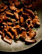 Печень порезать на порционные ломтики толщиной 1,5 см, мариновать 1 час на холоде (в холодильнике) в плотно закрытой эмалированной или стеклянной посуде в смеси вина, сливок и половины всего количества базилика, переворачивая или энергично встряхивая через каждые 15 минут для равномерности маринования.