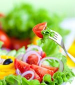 • Салат из свежих овощей (помидоры, перец, зелень) с отварной куриной грудкой (120 г), заправленный 1 ч.л. оливкового масла и лимонным соком.