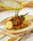 Потребуется 300 г телятины, 2 яйца, 1 ст. ложка сливочного масла, сок ½ лимона, 2 ст. ложки сливок, 50 г ветчины, соль, черный молотый перец.