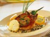 Из свиной корейки нарезать порционные куски так, чтобы в каждом куске была реберная косточка длиной не более 8 см. Приблизительный вес каждой порции - 130-140 г с учетом веса косточки. Кость зачистить от пленок, а мясо слегка отбить тяпкой, посолить и обжарить на жире до образования поджаристой корочки.