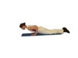 Теперь опуститесь на коврик на живот, поставьте кисти рук вплотную к грудной клетке, пальцы рук направлены вперед (или слегка в стороны), локти надо прижать к туловищу. Лучше всего в этот момент вспомнить, как выглядит кузнечик, который «коленками назад».