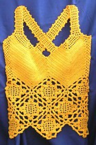 Довязать угловым полотном столбиками с 1 накидом и филейной сеткой по схеме 3 перед и спинку топа. Связать на уголках переда бретели длиной 42 см. Обвязать верх топа (по кругу, бретели, спинка, перед) ст. б/н. с пико на каждом 5-м столбике. Перекрестить бретели на спине, примерить топ и пришить бретели к наклонным сторонам углового полотна спинки.