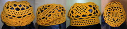 Беретик. Для донышка связать мотив по схеме 4. В 1-м и 2-м круговых рядах последняя дуга ряда сложная, составлена из 3 в. п. и 1 ст. с 1Н, поэтому следующий ряд начинается с середины дуги. Для тульи связать 5( или 6 для большого берета) квадратных мотивов, соединяя их во время вязания в кольцо. Нижнюю часть кольца обвязать цепочкой из воздушных петель, затем несколькими рядами филейной сетки с убавлениями до обхвата головы и 2-3 рядами сетки без убавок, закончить 1 рядом ст. б/н. Верхнюю часть кольца обвязать несколькими рядами филейной сетки с убавлениями до размера донышка и, обвязывая последний ряд ст. б/н., присоединить донышко к основной части берета.