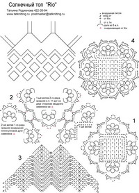 Собрать кольцо из 5 мотивов, для этого связать 4 квадрата, присоединяя во время вязания последнего ряда каждый следующий к уголку предыдущего по схеме 2, а 5-й квадрат присоединить к началу и концу полосы из четырех квадратов. Следующие 5 мотивов присоединять двумя сторонами (в 11 точках) в углы готового кольца. Еще 5 мотивов, 3-й ряд кольца, прикрепить так же. Довязать угловым полотном столбиками с 1 накидом и филейной сеткой по схеме 3 перед и спинку топа. Связать на уголках переда бретели длиной 42 см. Обвязать верх топа (по кругу, бретели, спинка, перед) ст. б/н. с пико на каждом 5-м столбике. Перекрестить бретели на спине, примерить топ и пришить бретели к наклонным сторонам углового полотна спинки.