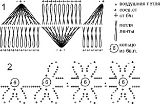Обвязанные ленты соединить цветочками из в.п. по схеме 2. Связать половинки цветочков на одной ленте, положить рядом вторую и, выполняя оставшуюся половину цветочков, присоединить следующую ленту.