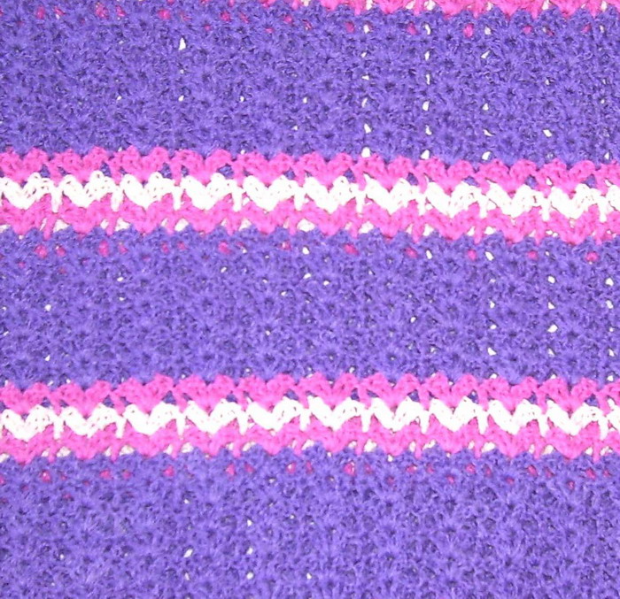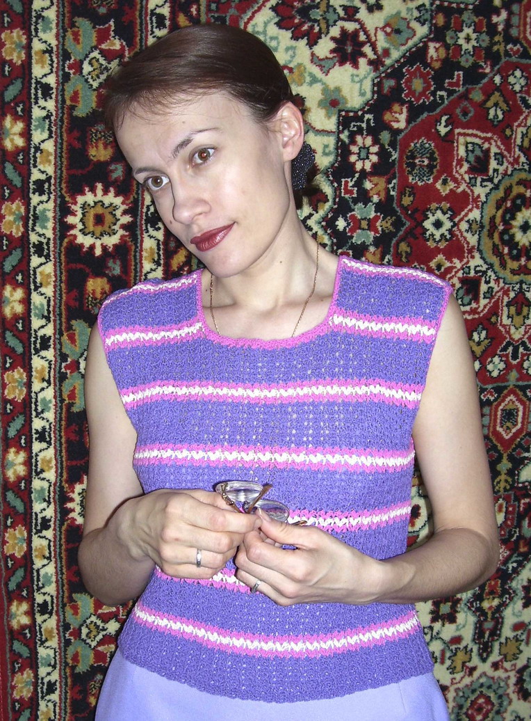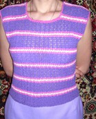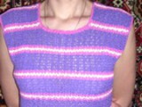 Выполнить все швы столбиками без накида или соединительными столбиками. Проймы и горловину обвязать розовой нитью двумя рядами ст. б/н. Низ изделия обвязать сиреневой нитью одним рядом ст. с накидом и один ряд ст. б/н.