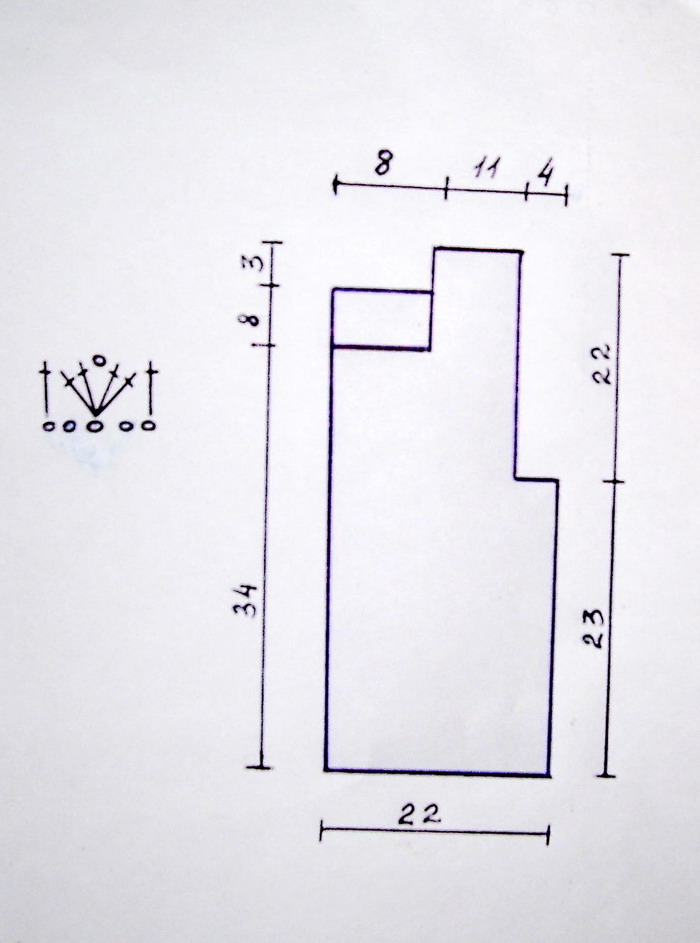 Спинка: связать цепочку из 104 возд. п. + 3 возд. п. подъема вместо 1-го ст. с накидом и вязать ажурным узором 26 раппортов. Последовательность чередования полос: 6 рядов сиреневыми нитками, 1 ряд – розовыми, 1 ряд – цвет слоновой кости, 1 ряд – розовыми. Провязав 36 рядов основным узором, оставить с обеих сторон для пройм по 2 раппорта. Провязать от пройм основным узором еще 27 рядов и оставить для горловины средние 8 раппортов. Продолжить вырез горловины на высоту 3 ряда. Плечо – 7 раппортов.