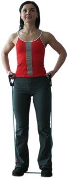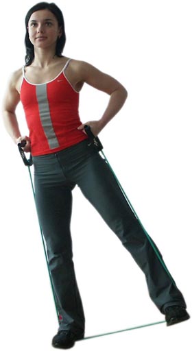 Исходное положение: поставьте ноги на ширине плеч, резиновый амортизатор пропустите между стопами и зафиксируйте на поясе. Колени слегка согнуты, спина прямая, локти по сторонам (фото 1).