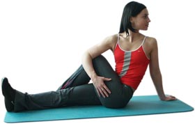 Растянитесь, сидя на полу. Спина прямая. Согните левую ногу в коленном суставе и заведите ее за правую. Правым локтем зафиксируйте область колена и постепенно заводите туловище в противоположную сторону (фото 4). Избегайте резких скручиваний!