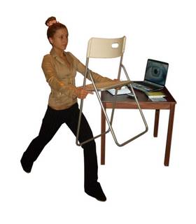 Расположите ноги в выпаде на ширине плечевого пояса. Стул поднимите на уровне плеч и выпрямите спину в естественном положении. Подтяните мышцы живота и вытолкните таз вперед, колени слегка согнуты (фото 1).