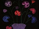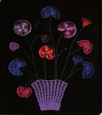 Из пасмы мулине (в 6 ниток) связать ленты различной длины. Один край собрать в точку, а второй обвязать, чередуя ст. б/н. на петле и 1 в.п. Получились цветы разной формы. Из зеленой нити связать стебельки и бутоны. Из сиреневой нити несложным полуажурным узором связать вазу. Собрать панно. Прикрепить детали к ткани. Оформить панно рамкой.