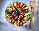 Готовый салат украсить веточками зелени и дольками помидоров.