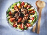 200 г любой отварной печени нарезать соломкой и смешать с 2 вареными, нарезанными мелкими кубиками картофелинами. Добавить 1 соленый огурец, нарезанный тонкой соломкой, 4 измельченных яйца и 100 г консервированного гороха или фасоли. Прибавить мелко нарезанный зеленый лук, рубленую зелень укропа и петрушки. Все смешать и заправить майонезом.