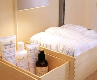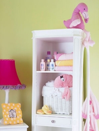 Хорошо, если в детской будут как шкафы с открытыми полками, так и с закрывающимися дверцами. На открытых полках удобно хранить подгузники, бутылочки и детскую косметику, а когда малыш чуть подрастет – книжки и игрушки, которые малышу будет легко достать. За закрытыми дверцами можно спрятать детскую одежду и белье.