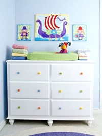 Чтобы зрение ребенка хорошо развивалось, как и его фантазия, малыша с самого раннего детства должна окружать достаточно разнообразная среда. Большие однотонные плоскости и крупные геометрические узоры слишком «агрессивны» и малышам не подходят. Предпочтение стоит отдать декору нежных пастельных цветов с мягкими волнистыми линиями. Лучшее украшение детской – фотографии и рисунки вашего ребенка. Не забудьте их как следует закрепить. В детской должно быть много ярких цветов. Например, ручки простого белого пеленального комода можно выкрасить в разные веселые цвета.