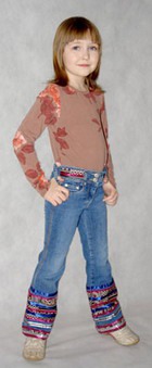 Для того чтобы удлинить джинсы, вам понадобятся небольшой кусок плотной ткани и различные ленточки. Если же переделываете джинсы для мальчика, возьмите ткань темного цвета, а вместо лент используйте шнур, тесьму и короткую бахрому.