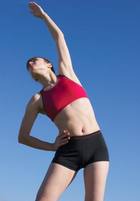 Потянитесь левой рукой за правую ногу, имитируя удар и приподнимая повыше левое плечо и лопатку. То же самое проделайте другой рукой. Сделайте по 10 ударов в каждую сторону.