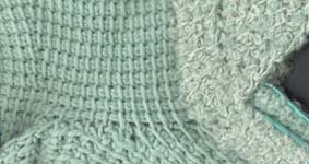 Капюшон. Набрать с лицевой стороны основной нитью петли по горловине изделия и вязать капюшон, выполняя от места плечевого шва прибавки через каждые 2 ряда до ширины полотна 38 см, далее без прибавок до высоты 25 см. Затем, на средней части капюшона, связать еще 12 см и пришить к боковым частям, оформляя головку.
