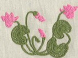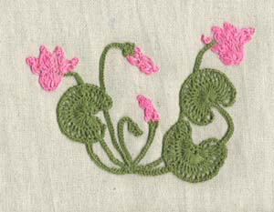 Для изготовления этого панно размером 20х30 см были использованы нити мулине (пасма в 6 сложений) двух цветов (розовая – для цветов и бутонов, зеленая – для листьев), вилки 4 и 5 см, крючок 1,5.