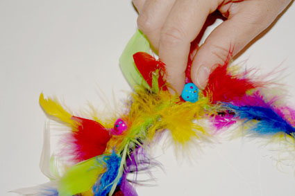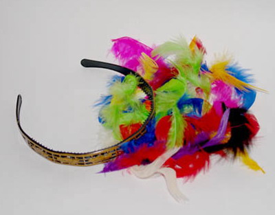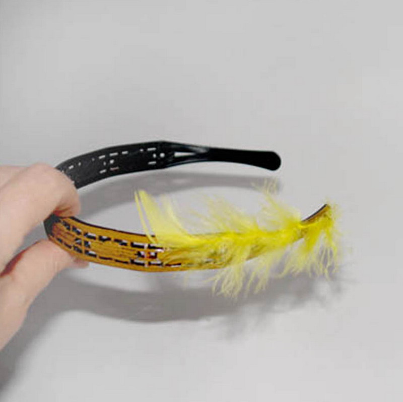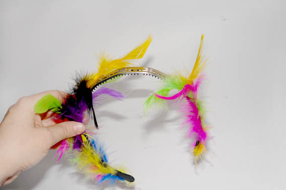 В центральной части обруча приклейте побольше перышек и в разных направлениях. В заключение прикрепите несколько бусин на края обруча.
