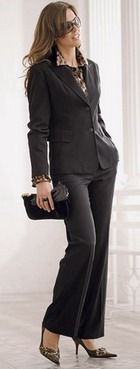 Вариант брючного костюма для деловой женщины - это удлиненный пиджак, закрывающий бедра, воротник, большие накладные карманы, металлические пуговицы небольших размеров.