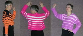 Интересно смотрятся двухцветные изделия, в которых использованы полоски разной ширины. В этом блузоне полосы одного цвета расширяются, другого – уменьшаются.