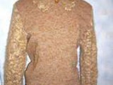 Для каждого рукава набрать фасонной меланжевой пряжей на спицы 56 петель и резинкой 1 х 1 вязать 24 ряда. Вязание продолжить лицевой гладью, соединив вместе две нитки: «Хималая» и «Карамель» спицами № 3,5. При этом убавить в первом ряду 9 петель на одинаковом расстоянии.