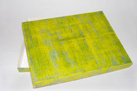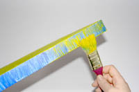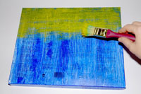 Затем покройте коробку желтой краской, кладите мазки перпендикулярно синему цвету.