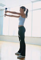 Исходное положение – стоя, ноги на ширине плеч, руки с гантелями опущены.