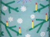 Для панно и открыток на вилке 2 см крючком 1,0 самым простым способом навязано много лент длиной от 4 до 35 см из зеленого ириса, на вилке 1 см из желтой синели связаны свечки высотой 5-8 см, на которых обычным крючком 1,0 столбиками разной высоты довязаны огоньки из красного ириса. Рамка выполнена из еловых веток и цепочки из воздушных петель (белый ирис + нить серебряного люрекса, крючок 1,0) с неравномерно расположенными пико. Снежинки связаны из такой же белой нити по схемам различных шестиугольников и жестко накрахмалены.