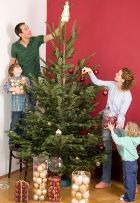 Итак, наступило время нарядить нашу красавицу. Сначала навешиваются электрические гирлянды. Затем при помощи ниточек развешиваются ёлочные игрушки. В первую очередь наиболее крупные, потом меньше и меньше. Некоторые умельцы вместо ниток используют канцелярские скрепки, слегка разогнув их, на маленький крючок вешая игрушку, а большой прикрепляя к ветке. Заключительным аккордом является укрепление на макушке пики или звезды, а также развешивание на ветках разноцветных «дождинок». Следуя старинному обычаю, можно повесить на ветки конфеты и что-то ещё вкусное, чтобы жизнь в следующем году была сладкой. Делать наряд ёлки слишком тяжёлым не следует, в этом случае можно "испортить кашу маслом". Ведь большое количество игрушек и мишуры ускоряет увядание ёлки. Кто-то любит разноцветные игрушки, кто-то подбирает украшения в одной цветовой гамме. Можно самим сшить разноцветные мешочки для подарков, прикрепить к ним серебряные и золотые звёзды и разложить всё это богатство под ёлкой.