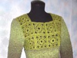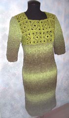 Начать вязание платья с кокетки ажурными квадратами. На спинке - вырез горловины прямо. На передней части вырез горловины – это два квадрата (см. фото). Горловину обвязать столбиками без накида.