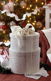 1. Белые обои с фактурной выделкой, оставшиеся от последнего ремонта, превращаются в элегантную упаковку. Впрочем, можно использовать и цветные обои, а для детского подарка можно взять обои с веселым детским рисунком. Перевязать подарок можно елочной мишурой или несколькими нитями елочного «дождика».