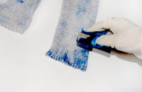 Налейте немного краски в одноразовую емкость и наденьте резиновые перчатки. Любую губку, например, для мытья посуды, обмокните в краску и легкими движениями нанесите краситель на кофту. Предварительно попробуйте произвести это действо на лоскуте ткани, чтобы представить, какой «рисунок» получится.